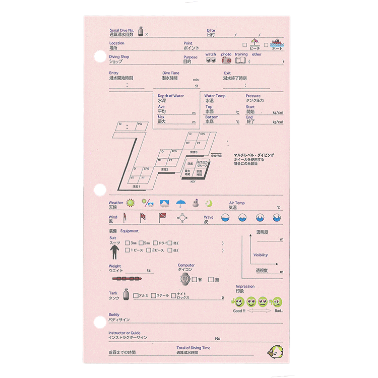 12種類のかわいいお魚のイラストがついて、使いやすいログブックレフィルです。PADI(パディ)のバインダー対応の3穴タイプです。