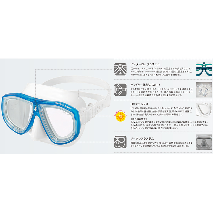 インターロックシステムを採用し安全性を追求したスクーバダイビング・スキンダイビング用ローボリュームで視界が広いスタンダードマスク