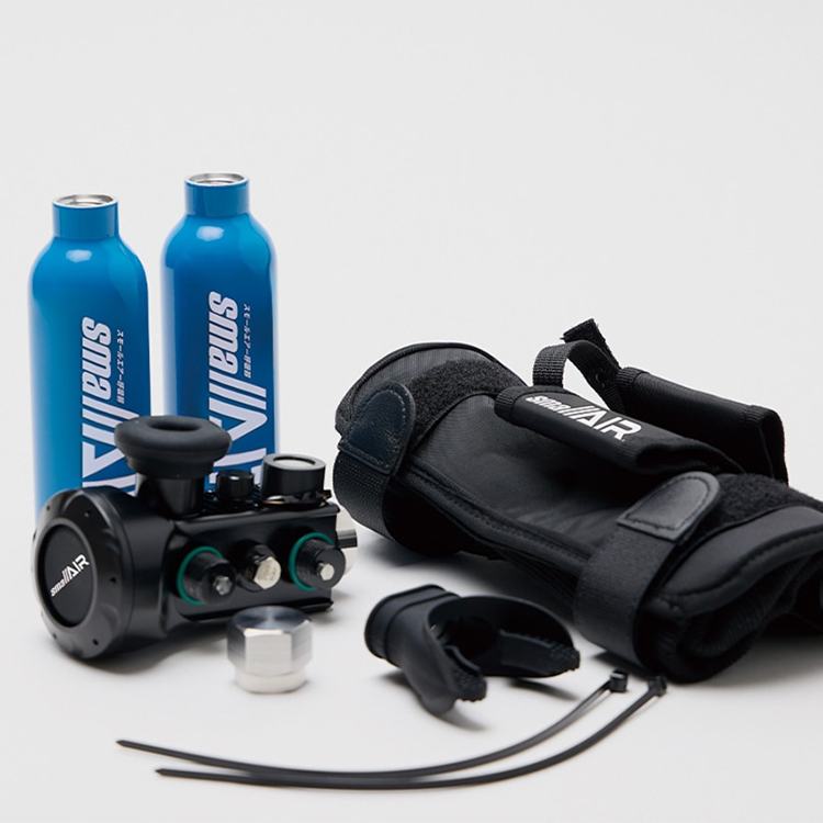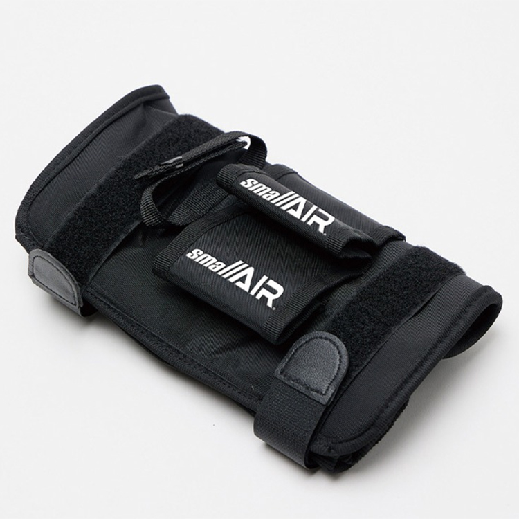 → small AIRは腕につける超小型ボンベです。600g、17cmと小型で超軽量。水着やラッシュガードのまま使うことができ、しかも両手が空きます。