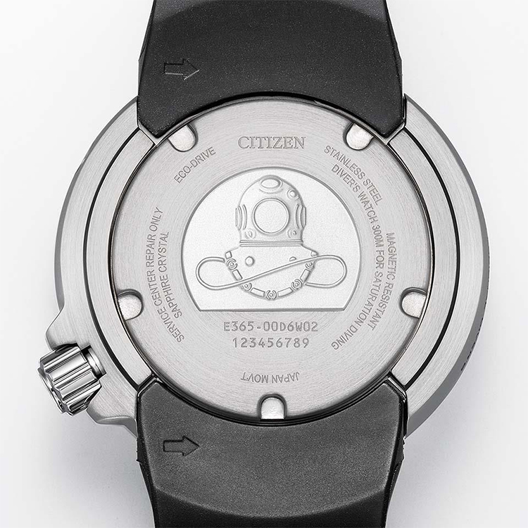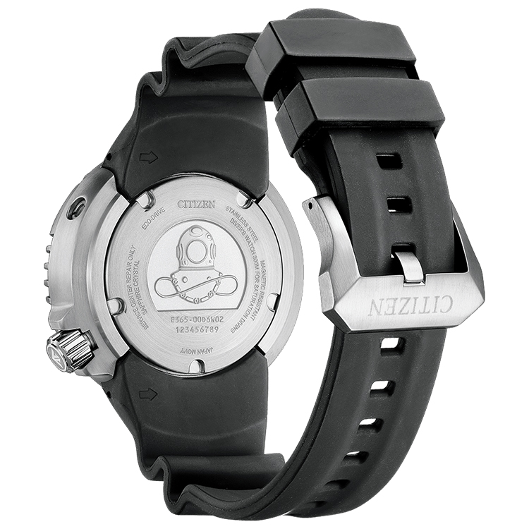 Go Deeperどれだけ潜っても届くことのない深い海の底へ。本格仕様のダイバーズウオッチ。プロマスター「MARINEシリーズ」。ケースの2時側に、時計の破損を防ぎ、ダイバーを守る機構「ヘリウムエスケープバルブ」を設置した300m飽和潜水用防水モデル。Cal.E365を搭載し、光が届かない深海の環境下でもフル充電から約1年間駆動し続けます。艶感のある文字板は、深海をイメージしたグラデーションをうっすらと施し、シンプルでありながらも重厚で力強い印象に仕上げています。立体感と迫力が際立つステンレス製の逆回転防止ベゼルは、操作が容易な120クリック仕様。ウレタンバンドには、ひび割れや破損が起こりにくく、環境に配慮した樹脂素材「BENEBiOL™」を配合しました。飽和潜水モデルの証として、裏ぶたに潜水用ヘルメットの柄、ケースの9時側には「300m PROFESSIONAL DIVER'S」の文字が刻印されています。
