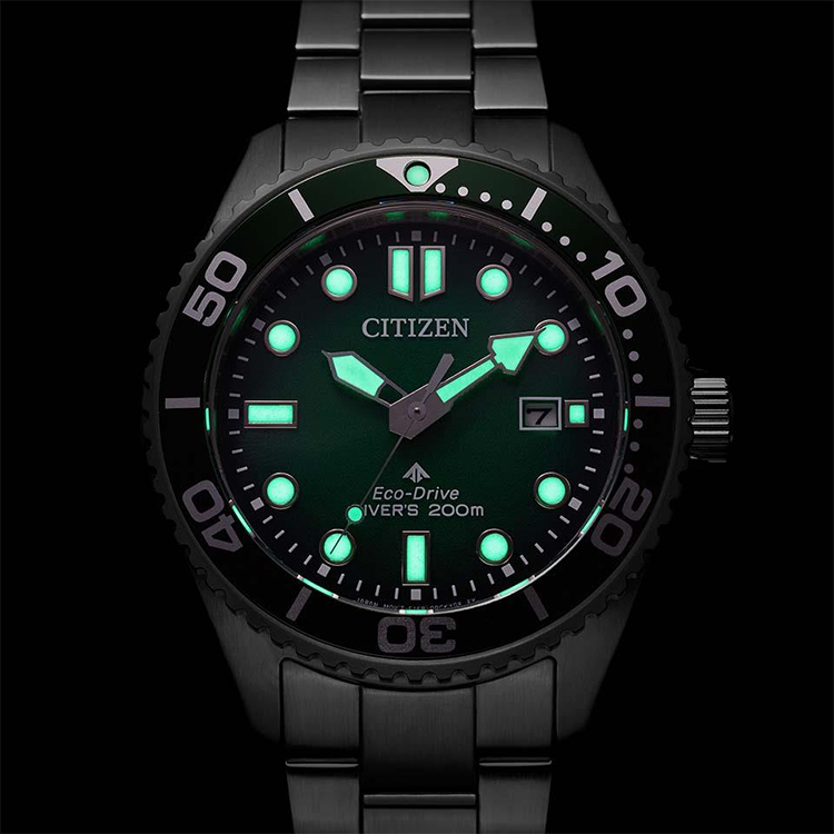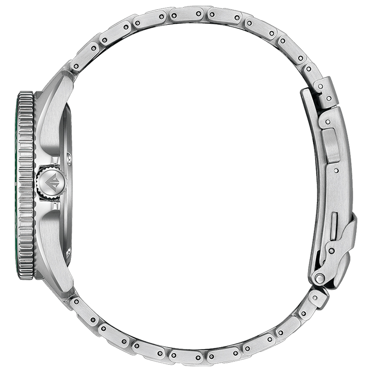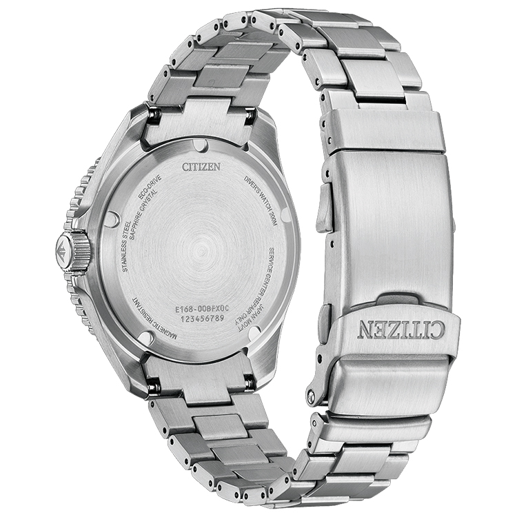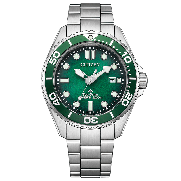 どれだけ潜っても届くことのない深い海の底へ。本格仕様のダイバーズウオッチ。プロマスター「MARINEシリーズ」。コンパクトなサイズ感と正統派のデザインにこだわった、エコ・ドライブ ダイバー200m。回転ベゼルは、外周全体にやや深めの溝を刻んだオーソドックスな仕上がりで、優れた操作性も実現しています。3連メタルバンドは、別体構造の中駒を用い、斜面をミラー仕上げにした立体感のある力強いデザイン。バックルは、ダイビングスーツを着用した際なども簡単に調整・装着できるラチェット付ダブルホールディングバックルを採用しています。中心から外側にかけてグラデーションを施した文字板は、深く澄んだ海中を表現。シンプルながらも高級感のあるフェイスに仕上げています。