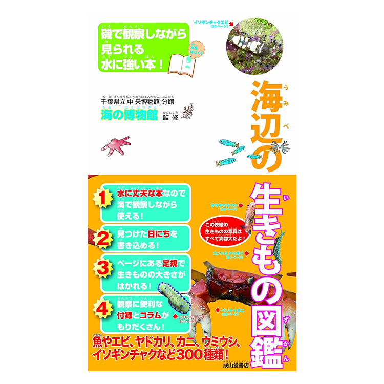 潮間帯に住む魚やエビ、カニ、ヤドカリ、ウミウシ、ヒザラガイ、貝、イソギンチャク、 ヒトデ、ウニ、フジツボ、海藻など、300種類以上を掲載。すべて海辺にいる生きものだけを掲載しているので、本書を片手に観察できます。