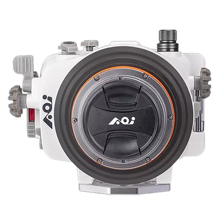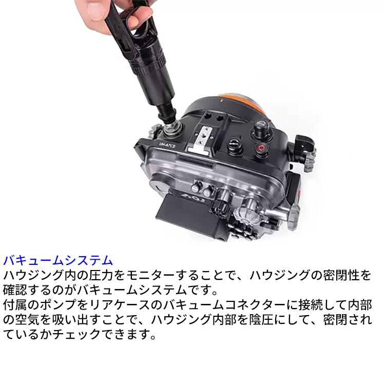 AOIハウジング独自のバキュームリークシステム、モイスチャーセンサーを搭載。カメラとハウジングの接続は、ホットシューコネクターでコードレス接続ができます。