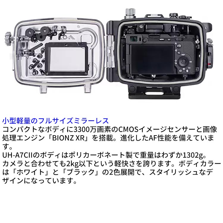 ソニーのフルサイズミラーレスカメラ「α7C II」「α7CR」用に設計された、コンパクトかつ軽量の水中ハウジングです。