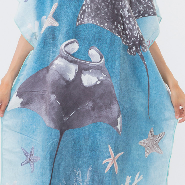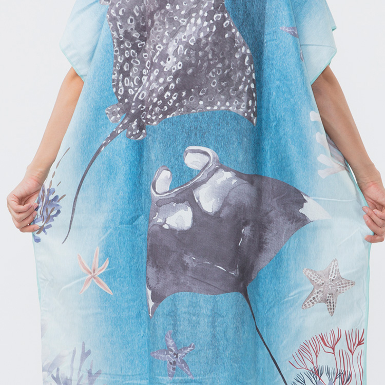 海の生物をプリントした肌触りの良い速乾性のマイクロファイバータオルでできたお着替えポンチョです。