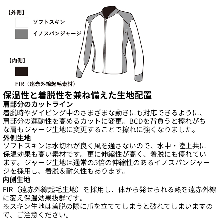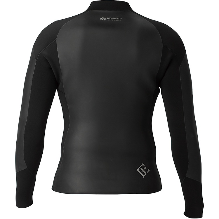 レイヤードの要となる、保温と防風を担う3mmジャケット水中では熱を逃しにくく、陸上では風を遮るソフトスキン素材を採用。内側には遠赤外線素材(FIR)を配置し、着用時の体温維持をサポートします。単体でも、ロングパンツやロングジョンと組み合わせても使える、Black Elementの基準となる一着です。