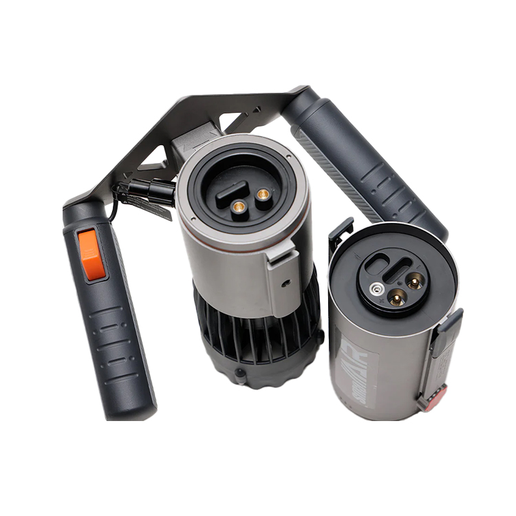 バッテリー脱着式水中スクーター。駆動時間約50分(ノーマルモード)USBタイプC充電・充電時間2時間/65W以上推奨